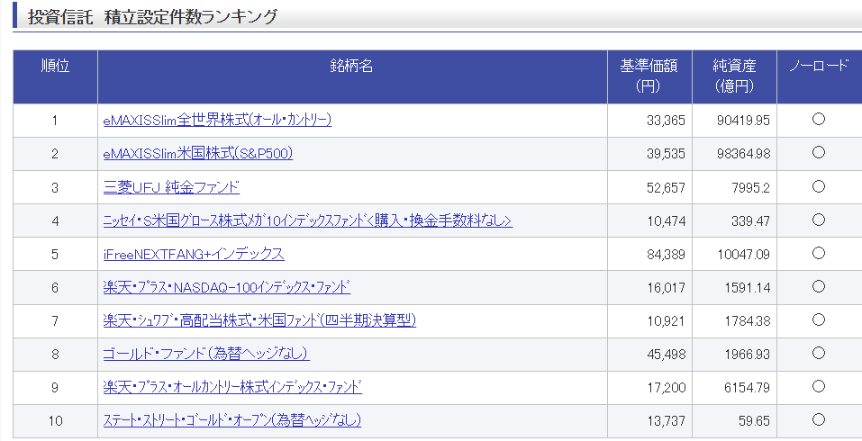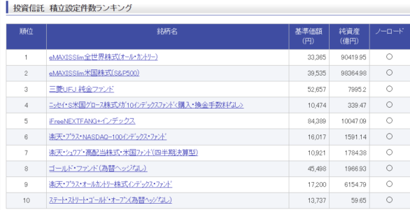 楽天証券でのランキング 積み立て件数