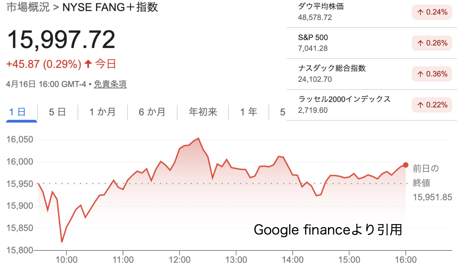 で戻って来ました。節目の16000には僅かに届かず