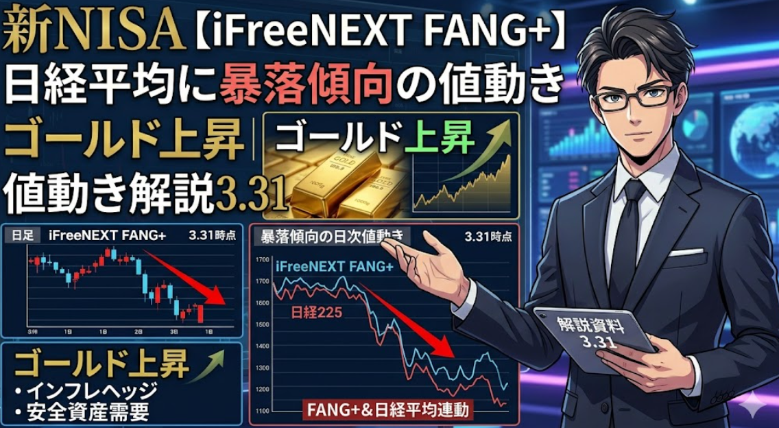 新NISA【iFreeNEXT FANG+】日経平均に暴落傾向の値動きゴールド上昇|値動き解説3.31