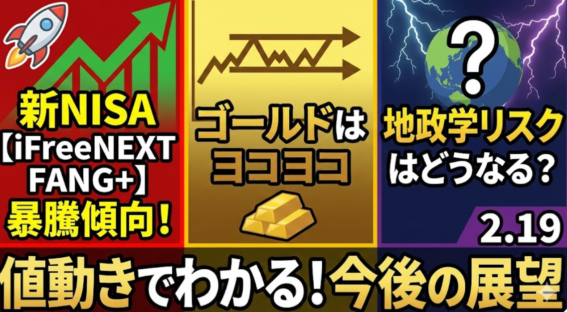 新NISA【iFreeNEXT FANG+】暴騰傾向の値動きでゴールドはヨコヨコ地政学リスクはどうなる?2.19